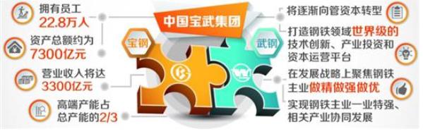 宝钢和武钢此次重组是业内首个集团重组与上市公司合并同步推进的央企联合重组,重组后成立的中国宝武集团,拥有员工22.8万人,资产总额约为7300亿元,营业收入将达3300亿元,高端产能占总产能的2/3。作为国有资本投资公司的试点企业,宝武集团将逐渐向管资本转型,打造钢铁领域世界级的技术创新、产业投资和资本运营平台。在发展战略上聚焦钢铁主业做精做强做优,实现钢铁主业一业特强、相关产业协同发展。