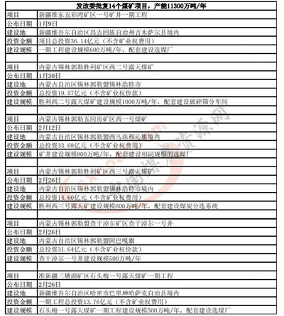 其中,国家发改委批复煤矿项目14个,合计产能11300万吨/年。
