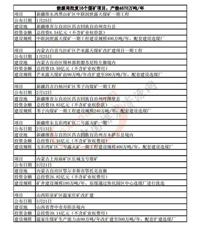 国家能源局批复煤矿项目16个,合计产能4670万吨/年。