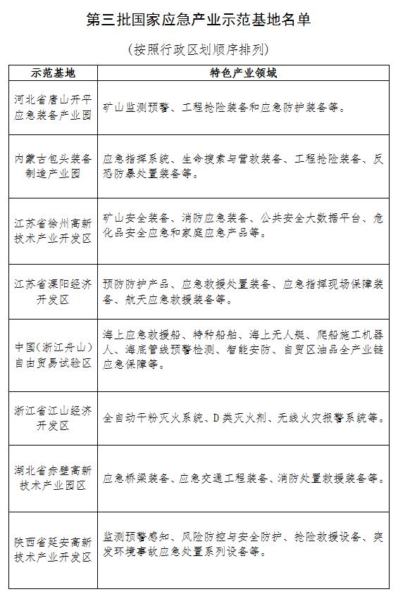 [中国石化新闻网2020-01-10]据工业和信息化部1月8日消息,工业和信息化部办公厅、国家发展改革委办公厅、科技部办公厅公布第三批国家应急产业示范基地名单,确定唐山开平应急装备产业园等8个应急产业集聚区为第三批国家应急产业示范基地(专业类)。