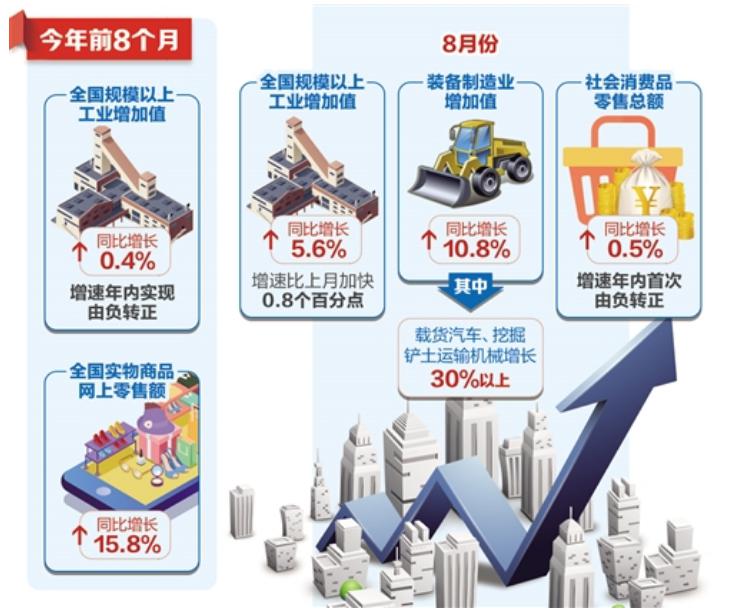1月份至8月份,全国规模以上工业增加值同比增长0.4%,增速实现由负转正。8月份,全国规模以上工业增加值同比增长5.6%,增速比上月加快0.8个百分点。41个大类行业中,实现增长的行业超过七成;同时,六成产品实现了增长。