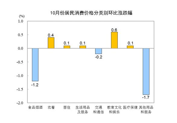 其他七大类价格环比五涨两降。其中,教育文化和娱乐、衣着价格分别上涨0.6%和0.4%;居住、生活用品及服务、医疗保健价格均上涨0.1%;其他用品和服务、交通和通信价格分别下降1.7%和0.2%。