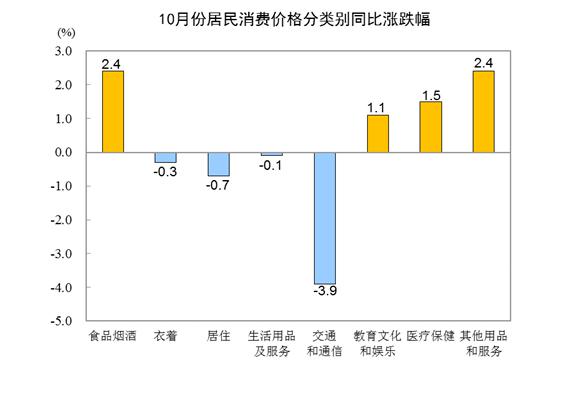 其他七大类价格三涨四降。其中,其他用品和服务、医疗保健、教育文化和娱乐价格分别上涨2.4%、1.5%和1.1%;交通和通信、居住价格分别下降3.9%和0.7%,衣着、生活用品及服务价格分别下降0.3%和0.1%。