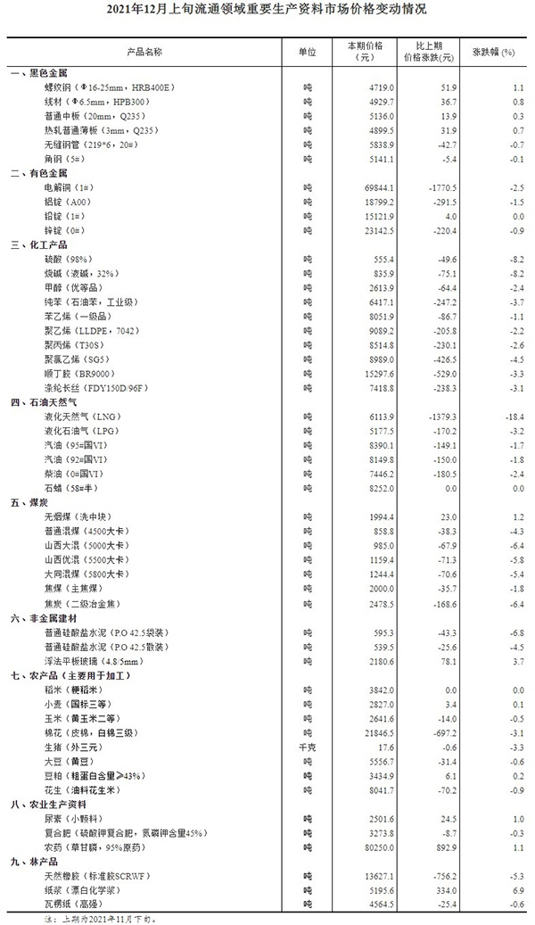 [中国经济网2021-12-16]人民网北京12月14日电(记者杨曦)国家统计局今日公布12月上旬流通领域重要生产资料市场价格变动情况,据对全国流通领域9大类50种重要生产资料市场价格的监测显示,2021年12月上旬与11月下旬相比,11种产品价格上涨,36种下降,3种持平。