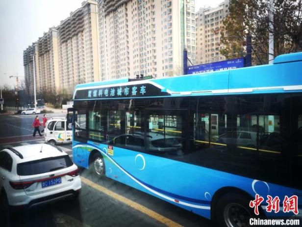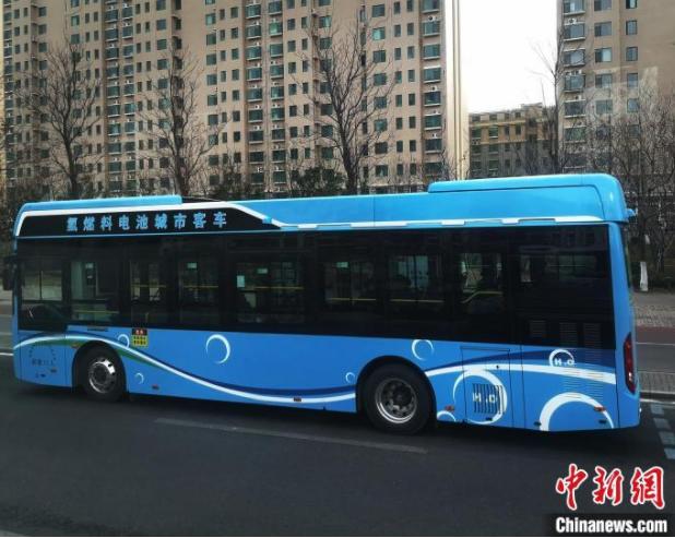 道路上行驶的氢能公交车。