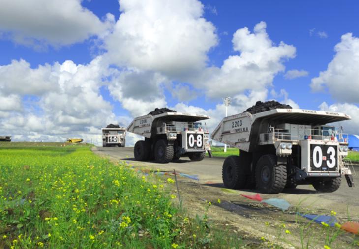 宝日希勒露天煤矿220吨煤炭运输车辆正在运煤。