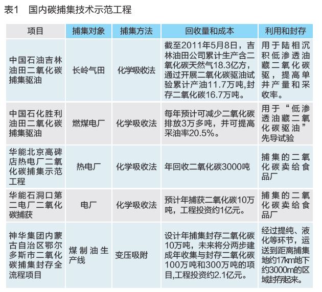 加快部署二氧化碳捕集驱油和封存、二氧化碳用作原料生产化工产品等项目,积极开发碳汇项目,发挥生态补偿机制作用。随着CCS(碳捕集与封存)技术的兴起,目前国内已有的二氧化碳捕集装置中,采用的捕集方法包括化学吸收法、变压吸附法等,其中以化学吸收法为主,各示范工程详细情况如表1所示。