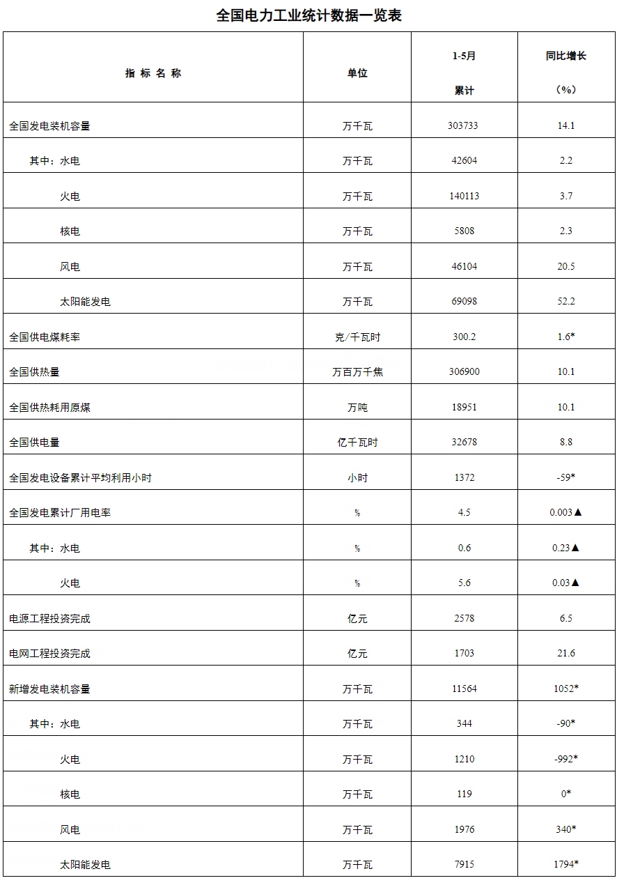 国家能源局发布1-5月份全国电力工业统计数据:全国累计发电装机容量约30.4亿千瓦同比增长14.1%(图)