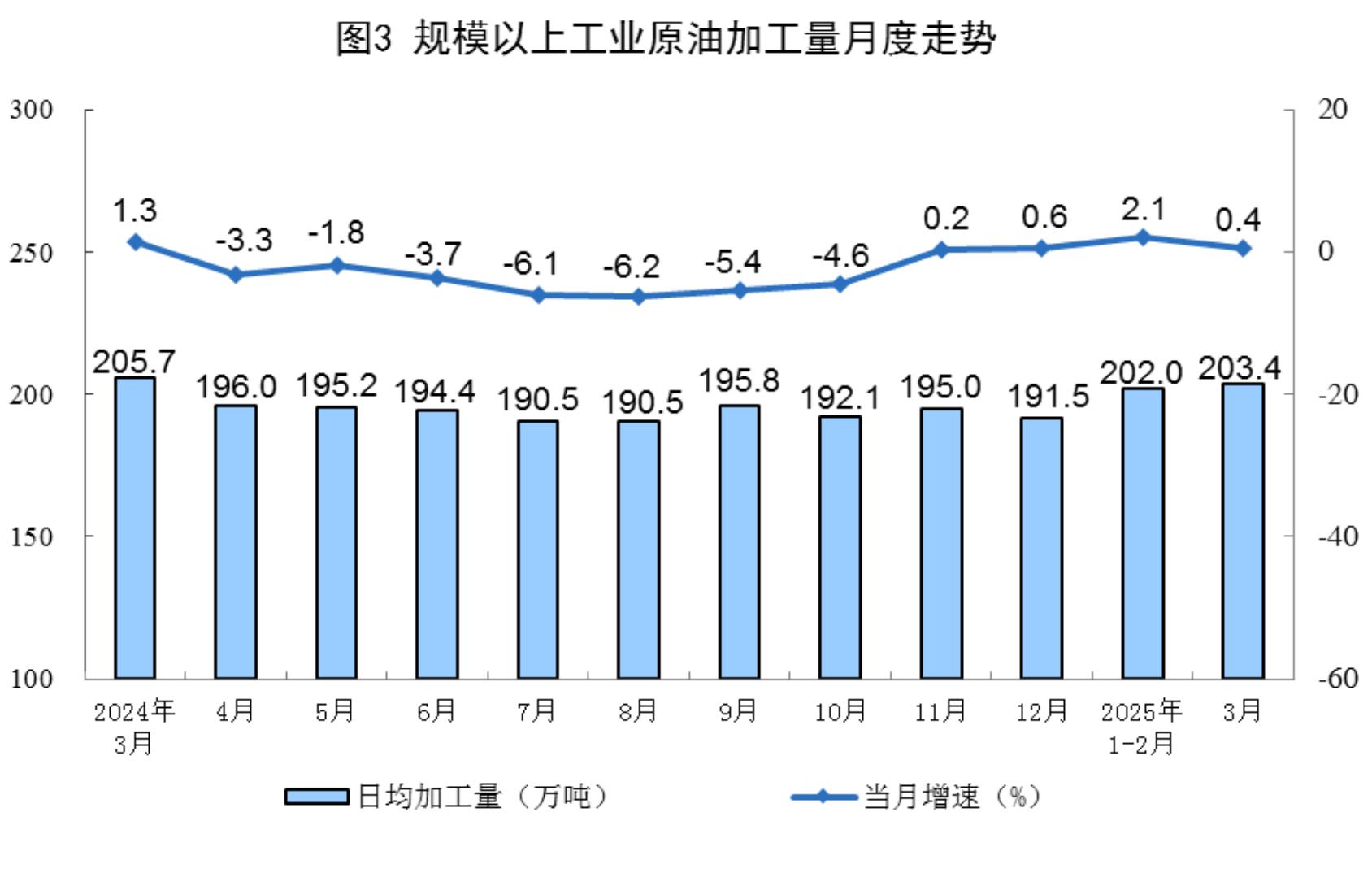 原油加工同比增长。3月份,规上工业加工原油6306万吨,同比增长0.4%;日均加工203.4万吨。1—3月份,规上工业加工原油18225万吨,同比增长1.6%。