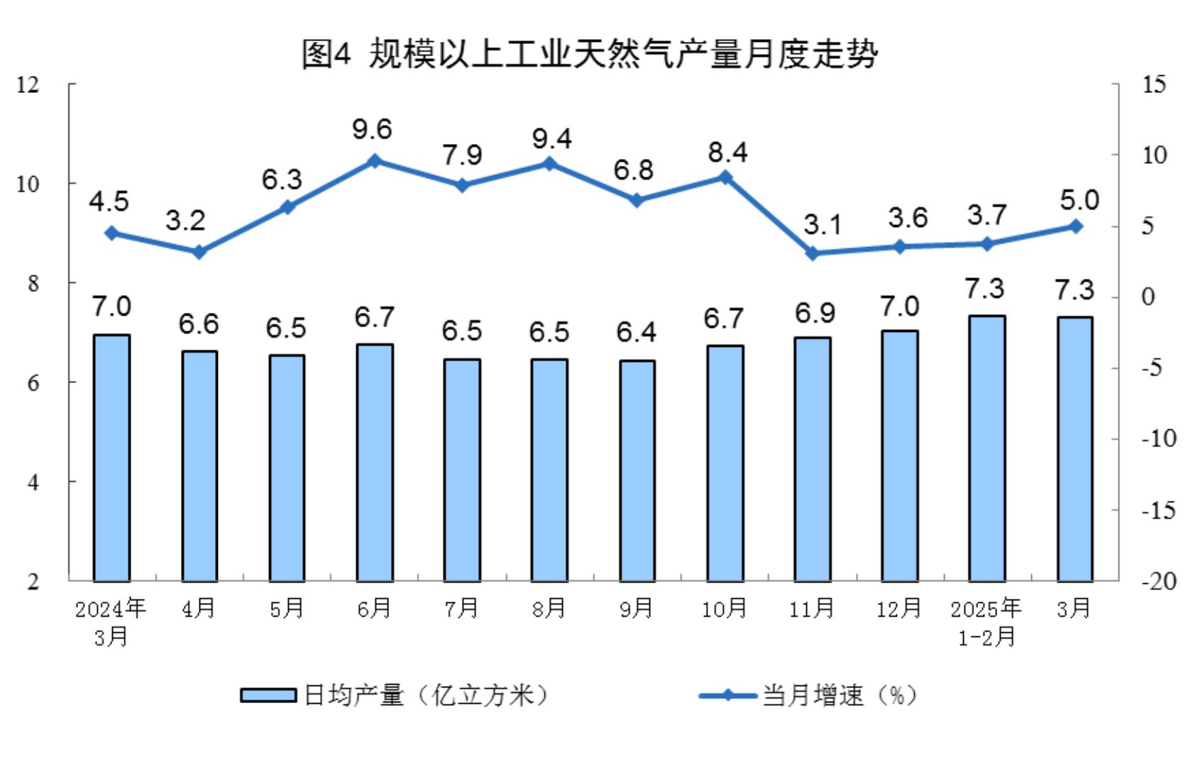 1—3月份,规上工业天然气产量660亿立方米,同比增长4.3%。