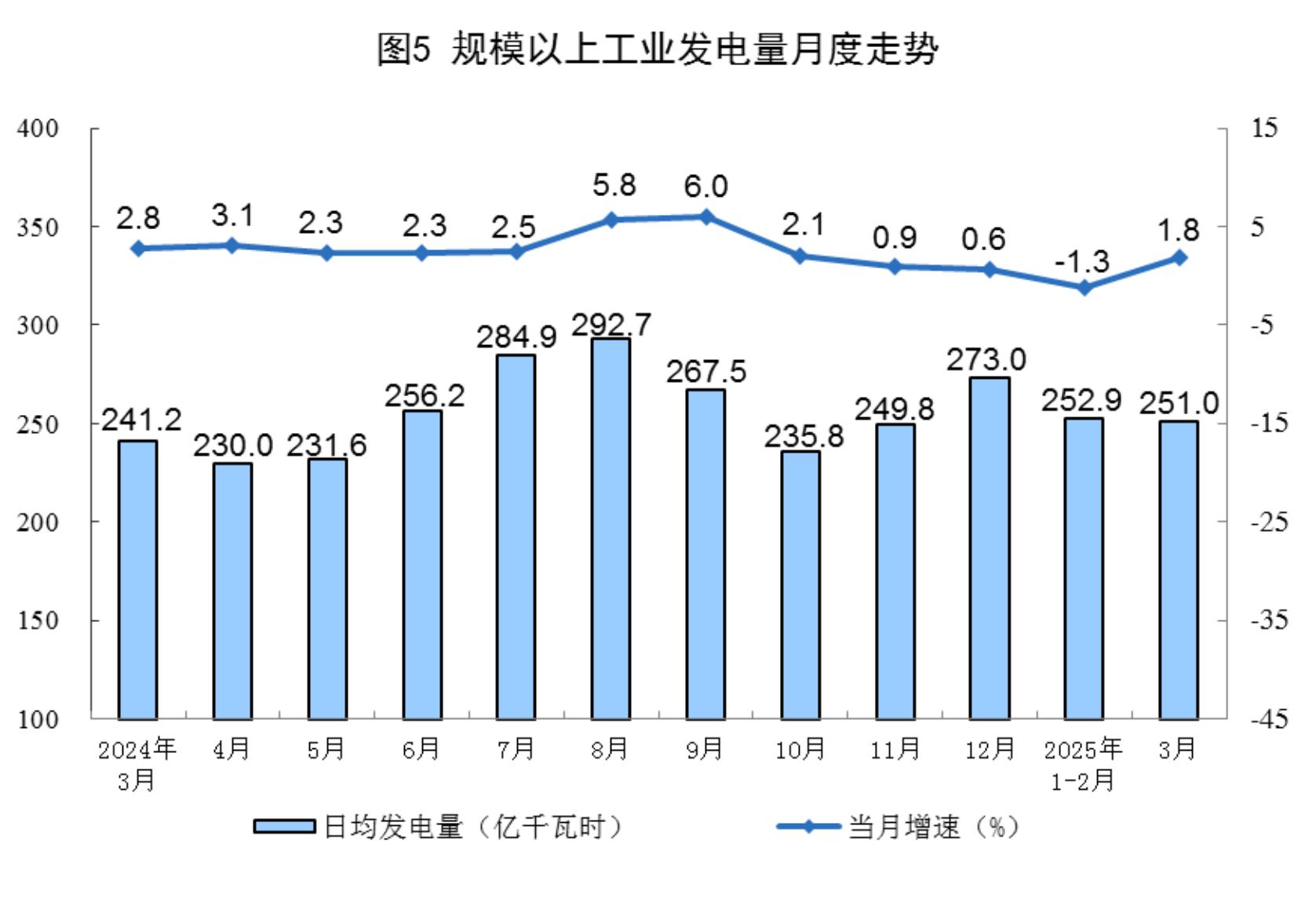 规上工业电力生产增速加快。3月份,规上工业发电量7780亿千瓦时,同比增长1.8%,增速比1—2月份加快3.1个百分点;日均发电251.0亿千瓦时。1—3月份,规上工业发电量22699亿千瓦时,同比下降0.3%,扣除天数原因,日均发电量同比增长0.8%。