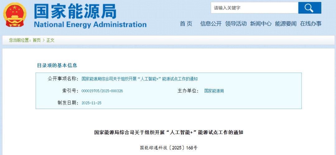11月28日,国家能源局发布《关于组织开展“人工智能+”能源试点工作的通知》。其中指出,征集发布高价值应用场景清单。能源企业对照本通知要求申报高价值应用场景。高价值应用场景应明确人工智能技术赋能的核心任务和实施路径,设定降本增效、降碳减排、安全保障等可量化、可验证的建设目标。国家能源局组织专家评审,遴选并发布“人工智能+”能源高价值应用场景清单,为能源领域人工智能技术应用提供实践指引。