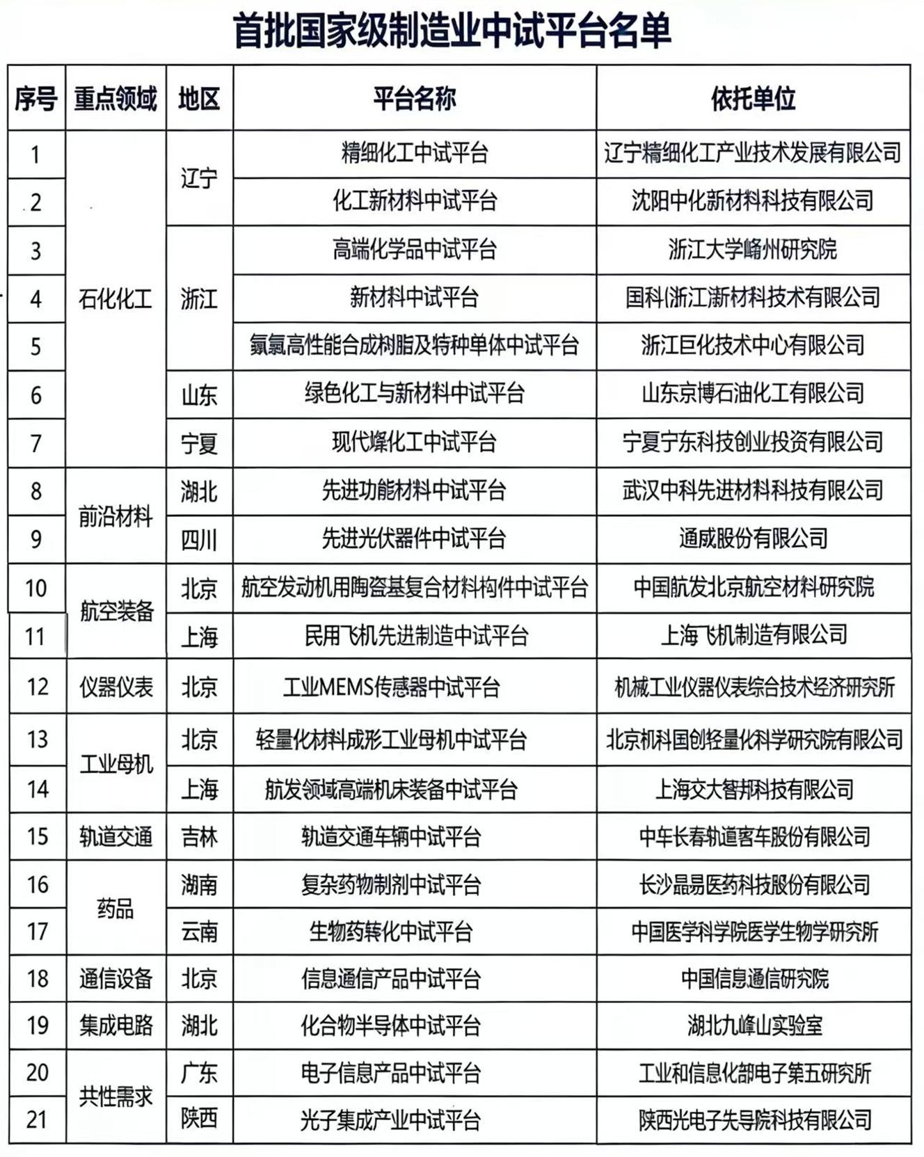 [中国石化新闻网 2025-12-15] 近日,工业和信息化部在辽宁省盘锦市召开制造业中试创新发展座谈会。会上发布了首批国家级制造业中试平台名单,全国共有21家平台入选,分布在石化化工、前沿材料、仪器仪表、通信设备、工业母机等多个领域。
