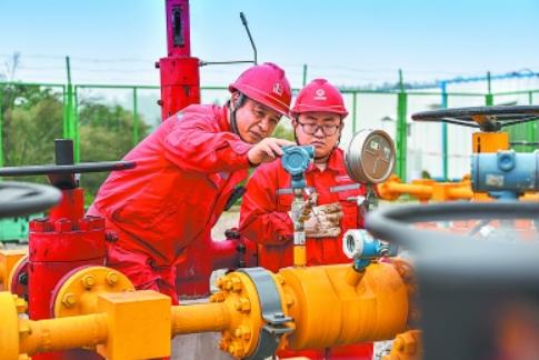 天然气开发量效齐增◀秉持“少井高产、效益开发”原则,中国石化加强储层精细描述和提产提效技术攻关应用,形成碳酸盐岩气藏、页岩气、致密气、海域等多领域、多类型发展格局,天然气产量持续增长、产能规模持续扩大。图为西南油气分公司新盛209井站值班员工定时巡检录取生产数据。