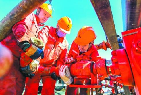 稳步探索深层煤层气领域中国石化持续加大深层煤层气富集机理与技术攻关力度,打出了首口深层煤层气井——阳煤1HF井。图为华北油气分公司员工在阳煤1HF井压裂施工前合力安装高压管线。