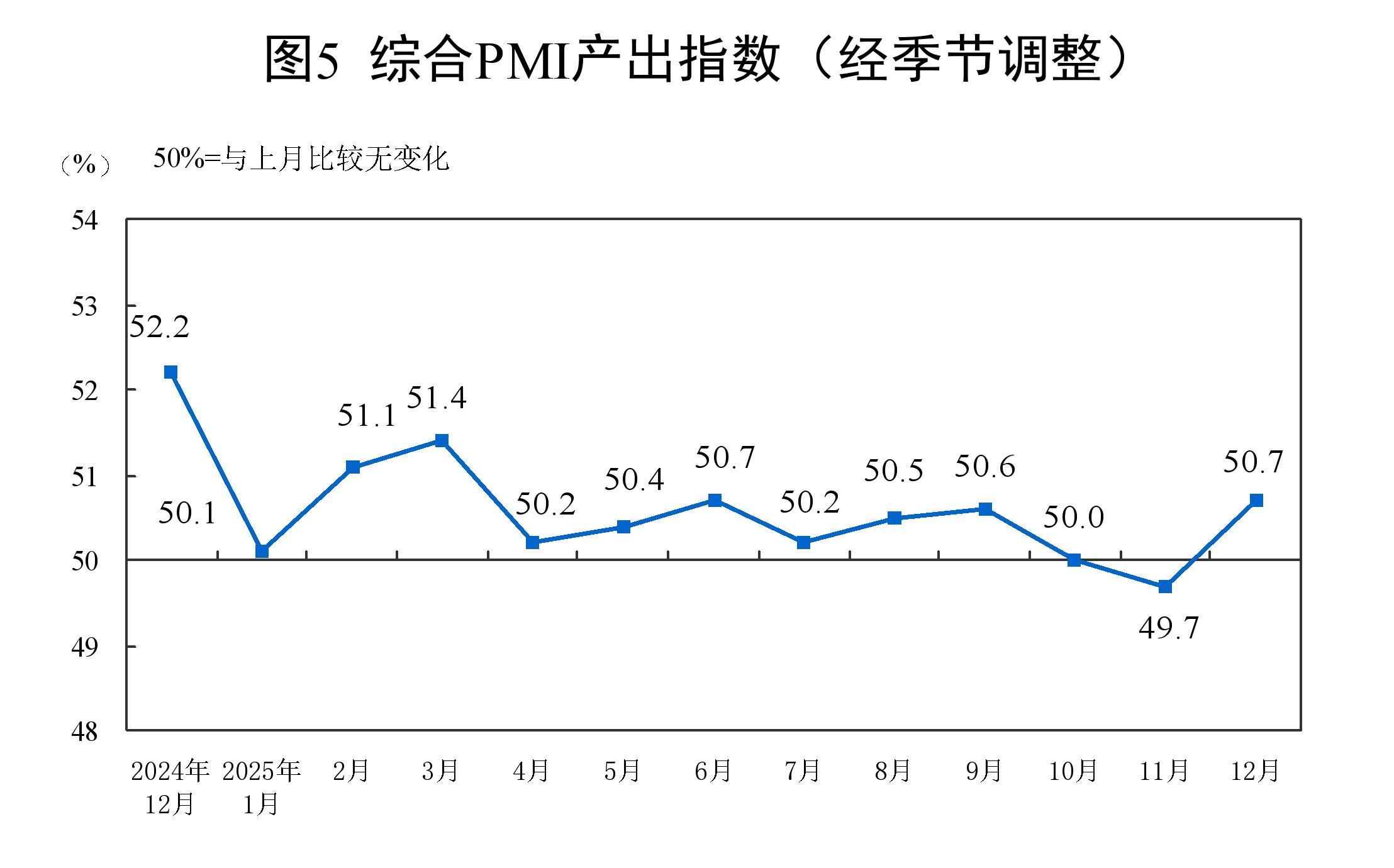 12月份,综合PMI产出指数为50.7%,比上月上升1.0个百分点,表明我国企业生产经营活动总体较上月扩张。