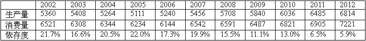 2002-2012年美国天然气依存度(单位:亿立方米)