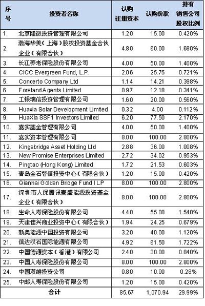 根据《增资协议》,25家投资者以现金共计人民币1070.94亿元(含等值美元)认购销售公司29.99%的股权。各投资者认购销售公司本次新增注册资本的情况如下(25家投资者基本信息附后):