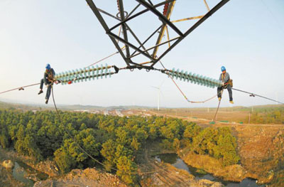 图为在安徽省明光市自来桥镇梅花村境内,电力检修工人在40多米的高空对输电设备进行检修。