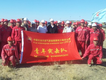 图为托洛姆巴耶夫(前排左四)与管道员工合影。赵琦冯守刚摄影报道