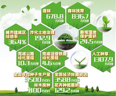 生产可供造林绿化林木种子3500万公斤,苗木410亿株,其中林木良种1100万公斤,良种苗木130亿株。林木种苗质量抽查合格率保持在90%左右。截至2016年,全国共审(认)定林木良种6600多个。公布了《中华人民共和国主要林木目录(第二批)》。印发《国家林木种质资源库管理办法》《林木种质资源普查技术规程》《林木种子生产经营许可证管理办法》《林木种子生产经营档案管理办法》。启动国家林木种质资源设施保存库(主库)建设,公布第二批国家林木种质资源库86处。启动全国林木种质资源保护工程项目和林木种质资源监测体系工程项目。新建国家级森林公园21处,年接待森林旅游人数超8.3亿人次。举办中国森林旅游节,认定全国森林旅游示范市、示范县36个。