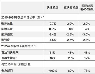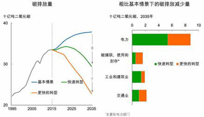 而在更快的转型情景下,到2035年,碳排放量将比2015年低32%。这与国际能源署450情景中的碳排放下降幅度一致。