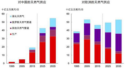 到2035年,天然气在中国能源需求中的份额将达到11%;进口天然气占总消费量的比重将从2015年的30%上升至近40%。欧洲天然气进口份额将从2015年的约50%上升至2035年的近80%。