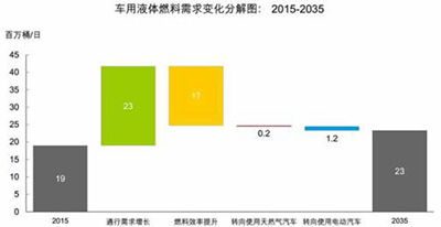 根据BP的预测,交通部门在展望期内消费了石油需求增长的近三分之二,其中汽车对石油的需求量为每天增加约400万桶。电动汽车的数量从2015年的120万辆增至2035年的约1亿辆(约占全球汽车总量的6%),一定程度上减缓了石油需求的增长。