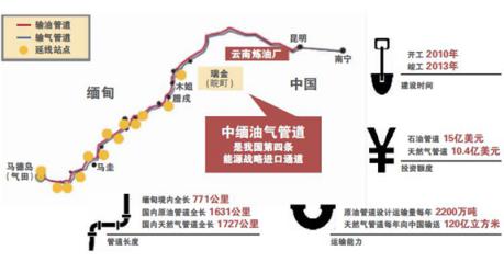 缅甸总统吴廷觉今年4月访华期间,两国就正式开通一条连接孟加拉湾与中国云南省的输油管道达成了协议。
