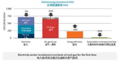 2016的全球能源投资为1.7万亿美元,占全球国内生产总值(GDP)的2.2%。其中,电力部门投资首次超过石油、天然气和煤炭的投资总和,而清洁能源的投资占总投资的43%,创历史新高。