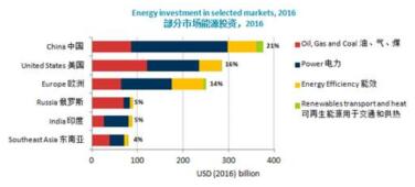 中国作为世界上最大的能源投资者,2016年占全球总投资的21%,虽然去年中国在燃煤电力领域的投资降低了25%,但是清洁能源发电、电网建设和能效方面的投资则日益增加。在美国,虽然2016年石油和天然气的投资急剧下降,但其能源投资仍然占全球总投资的16%。印度是去年增长最快的主要能源投资市场,由于政府大力推动现代化和电力行业的发展,其能源投资增长了7%,从而稳居全球第三大能源投资市场。