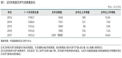 2017年最后3个月的天然气消费量采用近年来增幅最低值进行预测:按9月消费量3.7倍考虑,预计全年天然气的消费量为2313亿立方米,相比2016年总量超出331亿立方米;取值1-9月总体消费量的38%,则全年天然气消费量为2307亿立方米,相比2016年总量超出325亿立方米。以上两个预测结果均较2016年增长300亿立方米以上。全年2307亿立方米的天然气消费量更符合预期,但仍超过历史最高(2011年)213亿立方米的增长水平,2017年天然气消费量增幅将成为历史新高。2013-2017年我国天然气消费量见表1。
