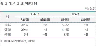 根据上述预测的2017年12月、2018年1月天然气需求量及供应量,如果不受气温的影响,2017年12月、2018年1月天然气处于“紧平衡”状态(见表5)。