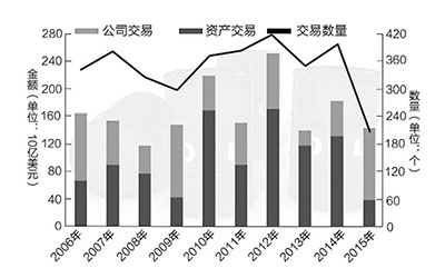 石油公司加大资源整合力度调整业务布局,剥离非核心资产成为保障现金流稳定的重要选择。2015年全球上游交易额为1400亿美元,2016年全球有出售意向的资产达2500亿美元,但实际交易额1300亿美元。石油企业压缩投资,资金紧张是交易低迷的主要原因。当然低迷形势下也有个案的突破,但毕竟是少数。2015年上半年,壳牌斥资700亿美元并购BG公司,巩固其天然气产业链优势,创油气交易纪录。