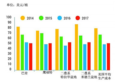 2001年至2016年美国原油产量区块页岩油开采成本变化图(数据来源:RystardEnergy)