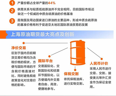 3月26日上午9时,原油期货正式在上海国际能源交易中心挂牌交易,上市首日即迎开门红,收盘涨3.34%,报收于429.9元/桶。作为我国首个对外开放的期货品种,原油期货以人民币为计价货币,同时接受美元等外汇资金作为保证金使用,既体现了建立人民币标价的国际原油基准的客观需求,也反映了我国原油期货的国际化特征。业内人士纷纷表示,原油期货有利于提高我国整个大宗商品市场交易话语权,成为人民币国际化建设的重要突破口。