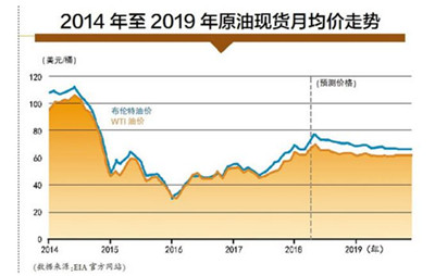 今年布伦特均价或破70美元/桶美国能源信息署(EIA)6月发布短期能源展望,预测布伦特油价2018年的均价为71美元/桶,2019年均价为68美元/桶。本次发布的预测价格比5月预测的价格要高2美元/桶。布伦特原油现货价格5月均价达到77美元/桶,比4月均价高5美元/桶,这也是自2014年11月以来的最高月均价。EIA预测WTI的2018年和2019年均价分别为64美元/桶和62美元/桶,比布伦特2018年均价和2019年均价分别低7美元/桶和6美元/桶。