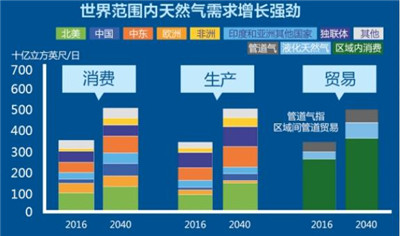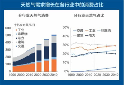 此前,埃克森美孚和BP两大石油巨头先后发布了2040年的能源展望,对天然气需求快速增长持乐观态度。埃克森美孚展望认为,到2040年全球天然气需求将比2016年增加近40%。BP则将能源需求三分天下,世界正走向多元化的能源发展趋势,其中石油、天然气和煤炭各占1/4,另1/4来自可再生能源和核能。世界主要石油公司高管们纷纷表示,油气仍是公司发展重点,天然气将是重中之重。天然气业务未来将成为这些公司的投资重点和主要方向,市场机遇和需求量是空前的。