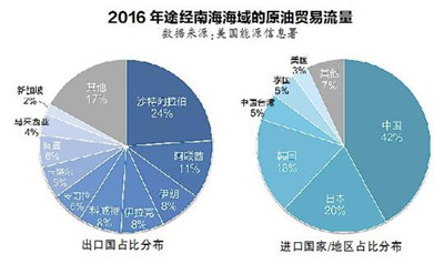 同样的,2016年日本和韩国也有超过90%的进口原油途经南海海域。日本和韩国进口的原油绝大部分来自中东产油国,通过马六甲海峡和南海海域进入其国内市场。