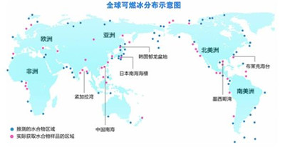 可燃冰广泛发育于浅海底层沉积物、深海大陆斜坡沉积地层和高纬度极地地区永久冻层中。在陆地上,分布于多年冻土地区地下200米到2000米区间范围。在海洋中,分布于海平面300米以下及海底数百米厚的沉积层中。