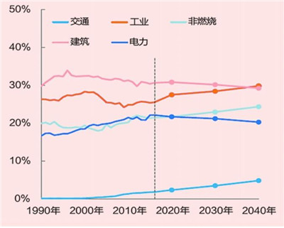 在结构转变过程中,不同领域的能源消费变化同样显著。BP、ETRI、IEA都注意到,全球范围内工业部门能源消费增长在逐渐放缓,建筑是增长最快的部门。工业部门能源需求在2040年达到峰值,之后保持稳定,并且电气化率还将不断提高。BP认为,天然气和电力将满足未来工业领域能源增量,2040年成为工业部门主要能源。