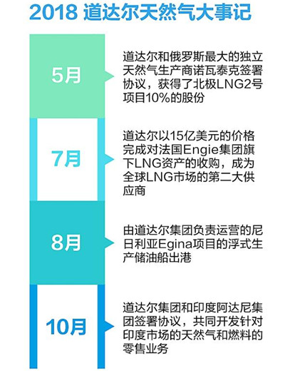 2018年,可谓道达尔的天然气“大年”。7月13日,道达尔以15亿美元的价格完成对法国Engie集团旗下LNG资产的收购,一跃成为全球LNG市场的第二大供应商。一个月个后,由道达尔集团负责运营的尼日利亚Egina项目的浮式生产储油船出港。10月17日,道达尔集团和印度阿达尼集团签署协议,共同开发面向印度市场的天然气和燃料的零售业务。