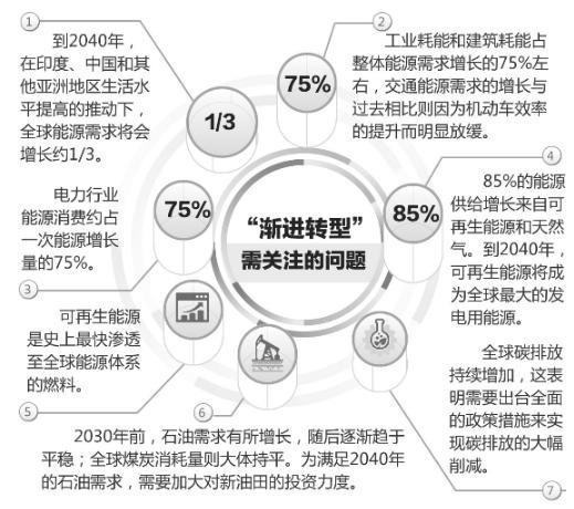 在《展望》中,BP对于2040年前能源转型和能源结构的分析以“渐进转型”为主要背景。该情景假定政策、技术和社会偏好的演进方式和速度与近期类似。戴思攀强调:“可再生能源是史上最快渗透至全球能源体系的燃料。可再生能源和天然气贡献了一次能源增长的绝大部分。”到2040年,可再生能源将贡献世界能源供应增量的一半,并成为最大的电力来源。