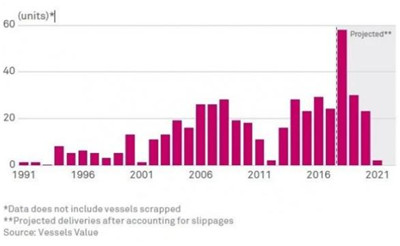 意大利船舶经纪公司BancheroCosta的研究负责人RalphLeszczynski认为,2018年和2019年(占目前订单的94%)的交付速度将影响未来多年的行业趋势。