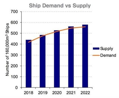 从供需来看,在LNG航运市场中,目前全球正在使用的LNG运输船约600艘,2019年将有40艘新船投入载运行列。2018年实现了近几年来最大规模的船力扩张,交付70多艘新的LNG运输船,相当于800多万立方米,而2017年为410万立方米。仅在2018年的前七个月订购的28艘大型液化天然气运输船,就超过了2016和2017年订购的26艘船的总和。而根据LNG海运贸易发展趋势测算,预计2018-2020年,全球LNG船总需求量约为100艘。