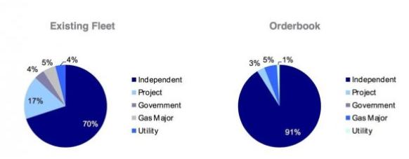以往LNG运输船队通常集中在大型航运业主,如马来西亚的MISC,韩国的K-Line,卡塔尔的Nakilat和日本的MitsuiOSKLines以及NipponYusenKabushikiKaishaLines。根据BancheroCosta的数据,12家最大的业主仍控制着大约一半的交易船队,约占订单总量的30%。