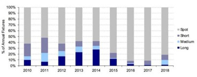 近年来,虽然LNG市场商业灵活性增加,交易合约期缩短,使得LNG运输船短期转租甚至按航次租赁趋势增加,但相比其它商船,LNG运输船在货物处理和再液化方面技术难度很大,造价高昂。传统船东为了保障新船建造的资金,更愿意坚持长期包租,此前LNG运输船新订单的签订需要10-20年的长期租约为依托,因此长期租约仍主导着LNG航运市场。