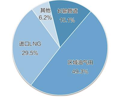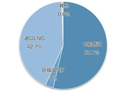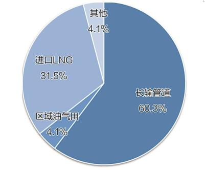 环渤海地区天然气资源供应以长输管道为主,进口LNG为辅,包括陕京线、榆济线,唐山LNG接收站、天津浮式LNG接收站、天津LNG接收站、青岛LNG接收站,大唐煤制气、区域内油气田等,气源多元化供应格局明显。2018年,长输管道气供应占比60.3%,进口LNG供应占比31.5%。