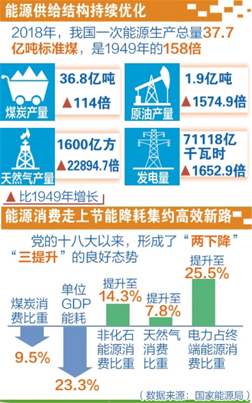 能源生产方面,我国已发展成为世界能源生产第一大国,实现了从供给短缺到总体宽松的巨大转变,走上了多轮驱动强劲、保障体系完善的新路。2018年,我国一次能源生产总量37.7亿吨标准煤,是1949年的158倍,年均增长7.6%。其中,煤炭产量36.8亿吨、原油产量1.9亿吨、天然气产量1600亿方、发电量71118亿千瓦时,分别比1949年增长114倍、1574.9倍、22894.7倍、1652.9倍;煤电、水电、风电、太阳能发电装机容量居世界第一,核电装机容量世界第三、在建规模世界第一,清洁能源发电装机占比提高到40%左右。