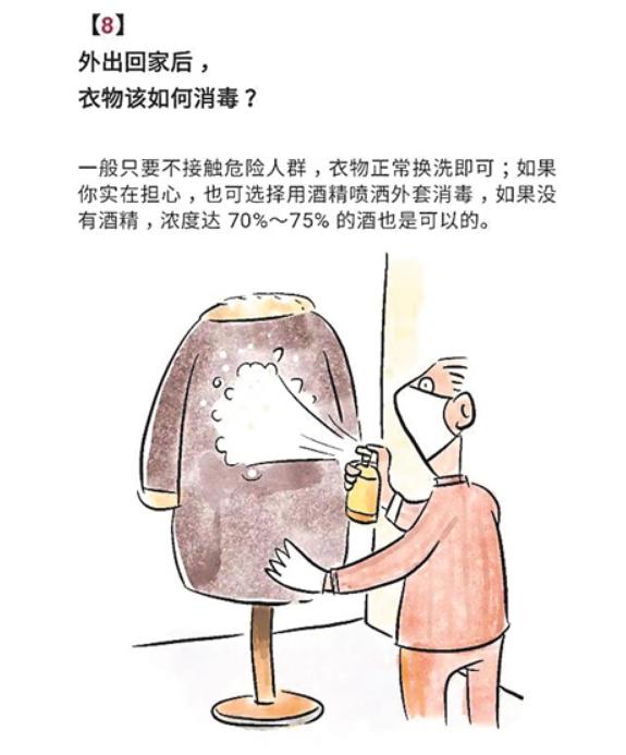 一般只要不接触危险人物,衣物正常换洗即可。如果实在担心,也可选择用酒精喷洒外套消毒;如果没有酒精,浓度达70%到75%的酒也是可以的。